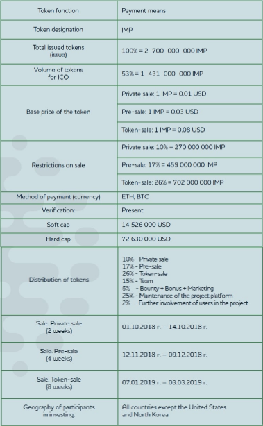 Volume of tokens for ICO: 53% = 1 431 000 000 IMP